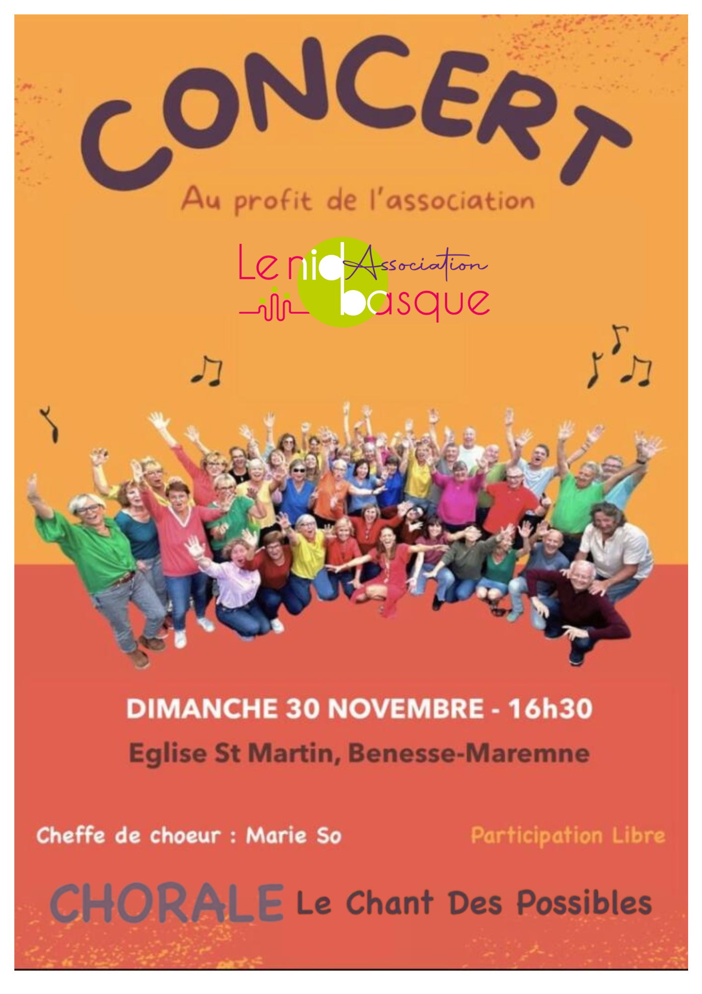 Nous avons le plaisir de vous informer qu’un concert solidaire sera organisé au profit de l’association Le Nid Basque par la Chorale Le Chant des Possibles. Elle se produira